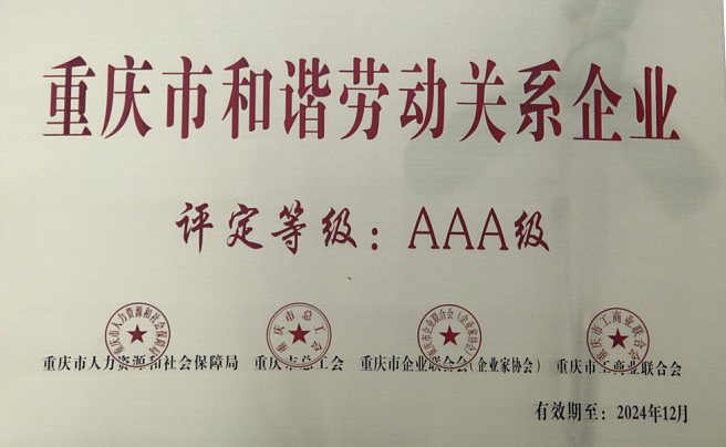 【喜讯】公司获评“AAA级重庆市和谐劳动关系企业”